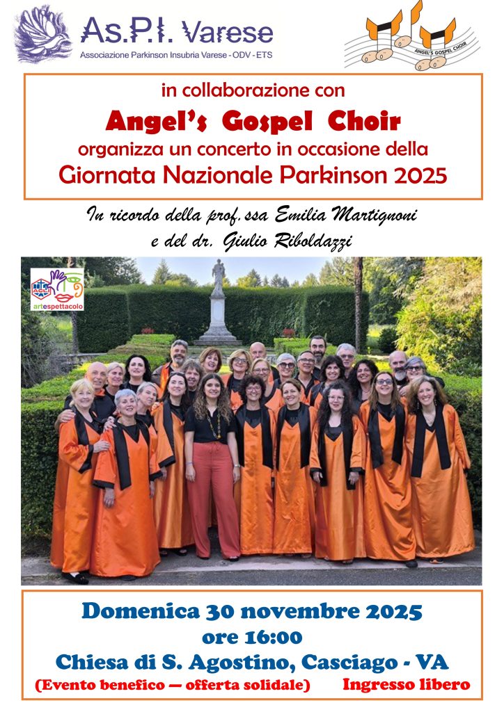 In occasione della giornata Parkinson 2025, siamo lieti di invitarvi al concerto degli “Angel’s Gospel Choir” presso la chiesa di Sant’Agostino a Casciago, Varese.
